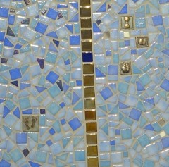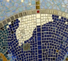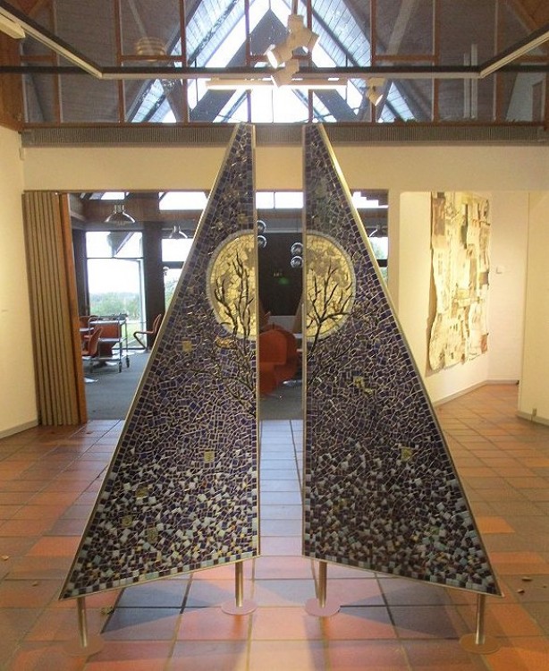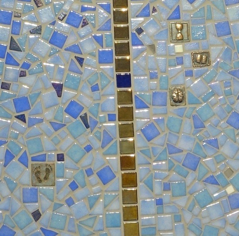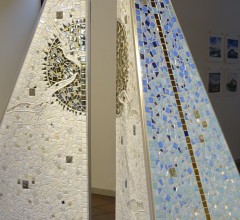 ”Tell Us” 2023, utomhus/inomhus skulptur i glasmosaik med bronsdetaljer. Tot höjd ca 205 cm.