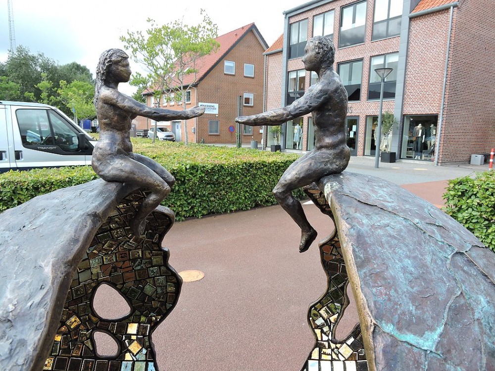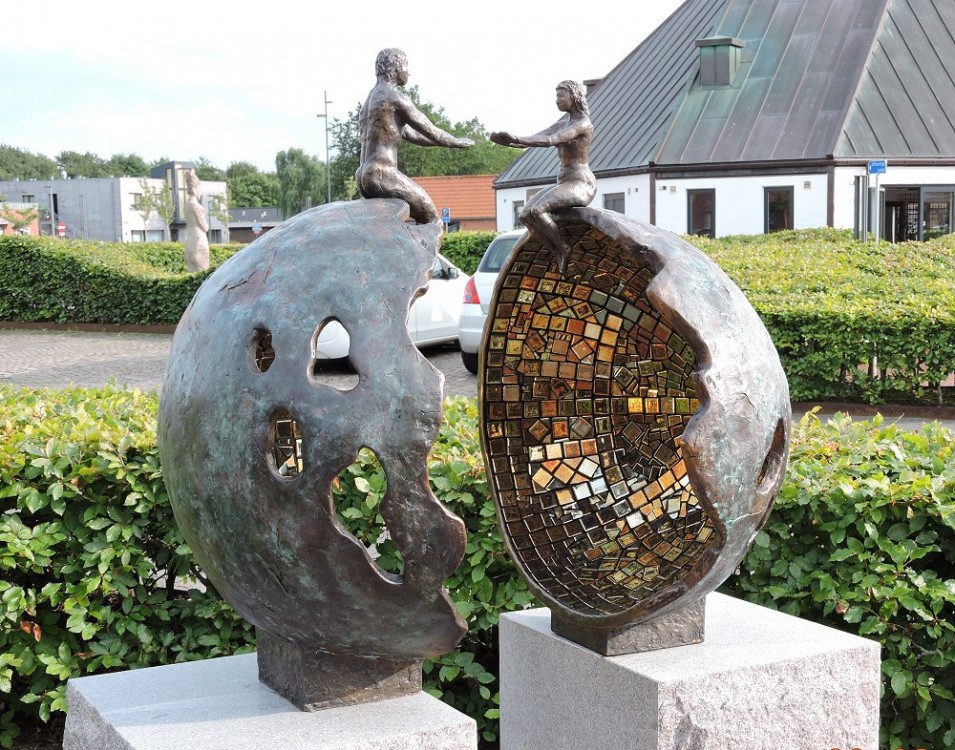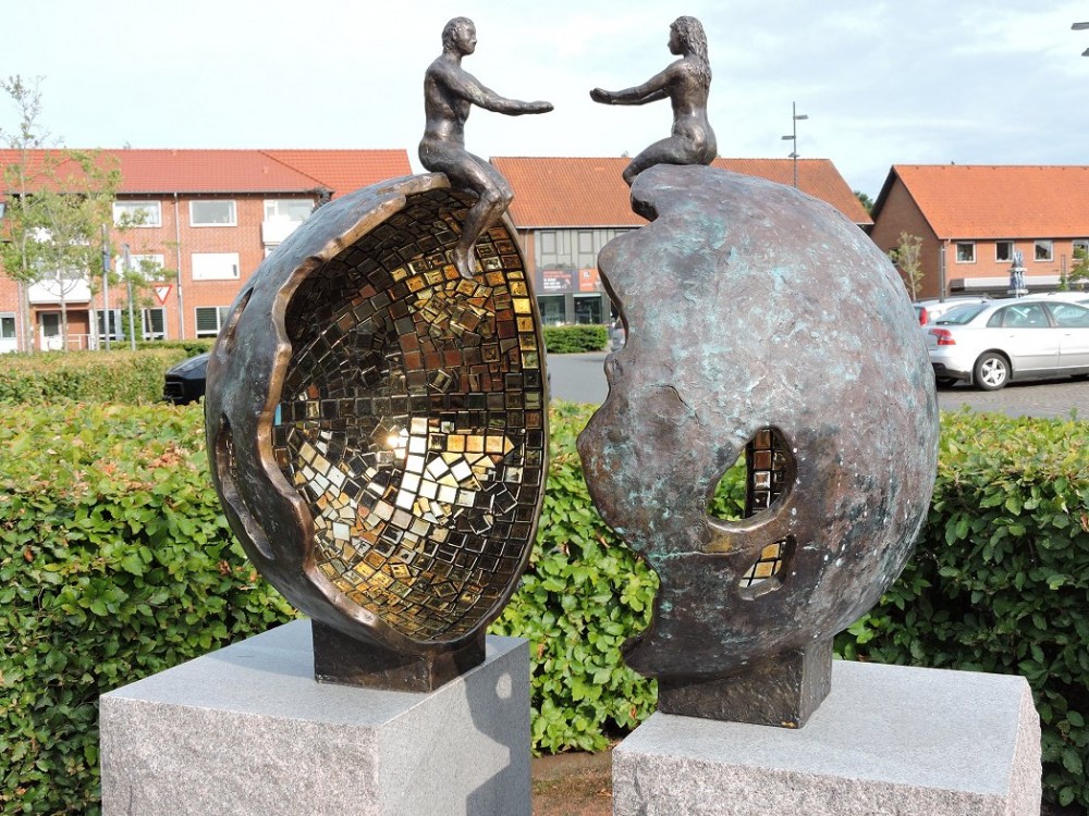 "It concerns us" 2021, Permanent skulptur Torget Ølgod, Danmark, Brons, glasmosaik och skånsk Bjärlövsgranit, höjd 170 cm inkl. sockel