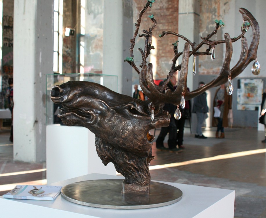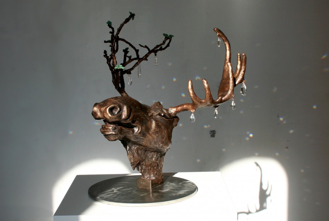 Bal på Slottet / Ball at the Castle, Brons med förgyllt inre (23K), handslipade kristallprismor, platta i rostfritt stål, storlek höjd 58 cm, bredd 50 cm, djup 62, unik.