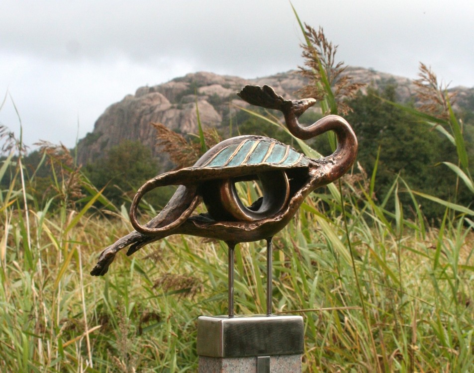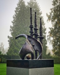 Bortom tid och rum / Beyond Space and Time, Brons, polerad diabas med förgylld detalj, sockel i ljusgrå bohusgranit, tot höjd 170 cm. Foto Magnus Holmvik, Rottneros Park 2018.