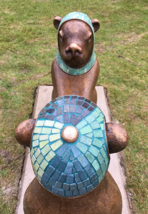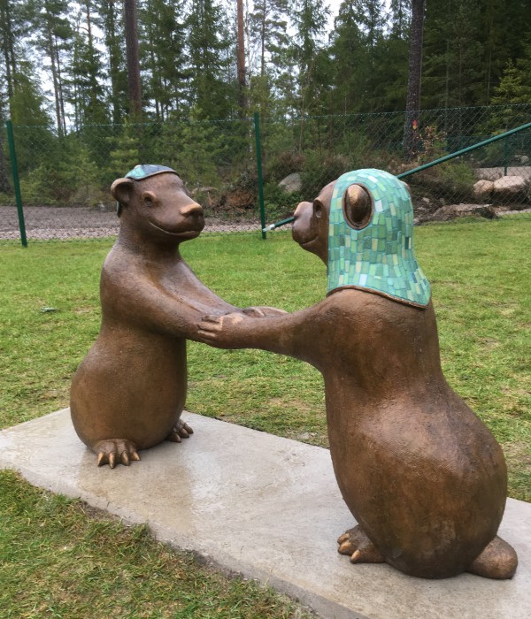 Ana Saeid betyder ”jag är glad” på arabiska, jag lade till ett n i Ana till Anna så att det också går att läsa som ett flicknamn. Saeid betyder glad och är ett arabiskt och persiskt pojknamn. Ett flicknamn och ett pojknamn, två figurer som leker tillsammans. Anna representerar gammelsvenskarna och Saeid, de nyanlända. Anna och Saeid samarbetar, de håller om varandras armar och skapar genom det en brygga eller en variant av ”Kejsarstolen” där barnen på förskolan kan hoppa upp och sätta sig i och bli en del av leken. De kan också krypa under ”Kejsarstolen” eller klättra runt och på figurerna. Den ena figuren har något som eventuellt kan läsas som en sjal men också som en rymdschalett eller en dykardräkt och den andra bär en liten mössa. Mössan och schaletten är gjorda av Kosta glasmosaik från trakten.