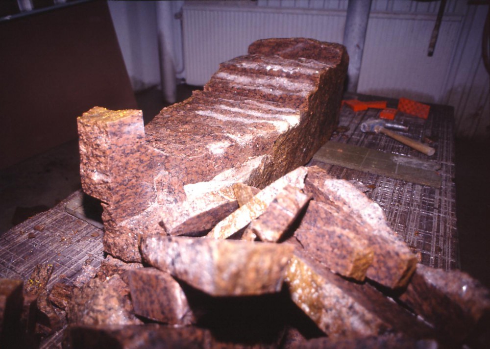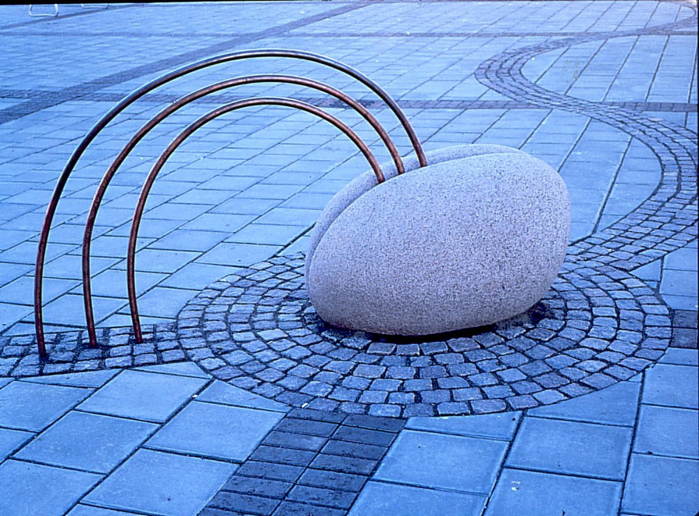 I Moröbacke torgs totaldesign i samarbete med arkitekter och gatukontor, fick jag pga kylan inte använda vatten mer än sommartid - därför symbolisk vattenslinga i röd granitgatsten över hela torget med tre skulpturer placerade på varsin rondell/station, den första stenen, Fjällfors, med samtliga samebyars gränsdragningar, osynliga gränser som löper inom kommunen inhuggna på stenens norra sida.