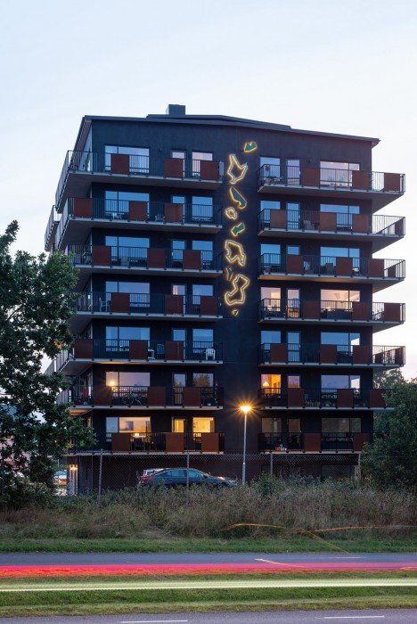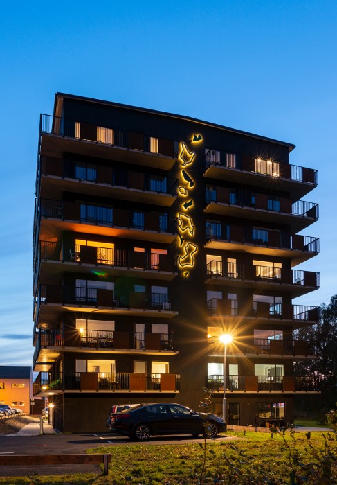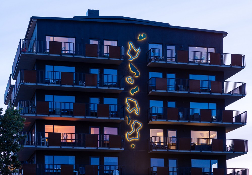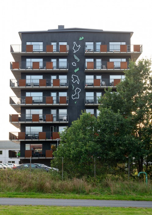 Konstnärlig gestaltning på väggen till ett nybyggt hyreshus på gamla regementsområdet T4 i Hässleholm. Gestaltningens former är lösryckta delar från ett M90-kamouflagemönster som har redigerats i skala, färg och form. Resultatet är ett samarbete mellan konstnär (Ossian Gustavsson), byggare/beställare (K-Fastigheter), tillverkare (VKG Vadstena konstgjuteri) och montage (Porcarelli studio).