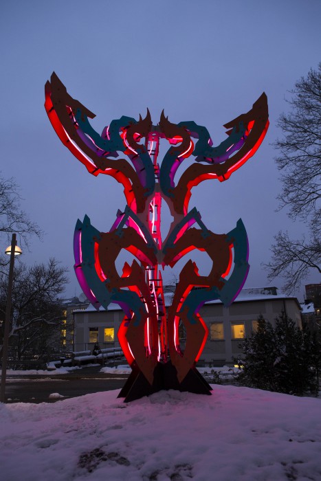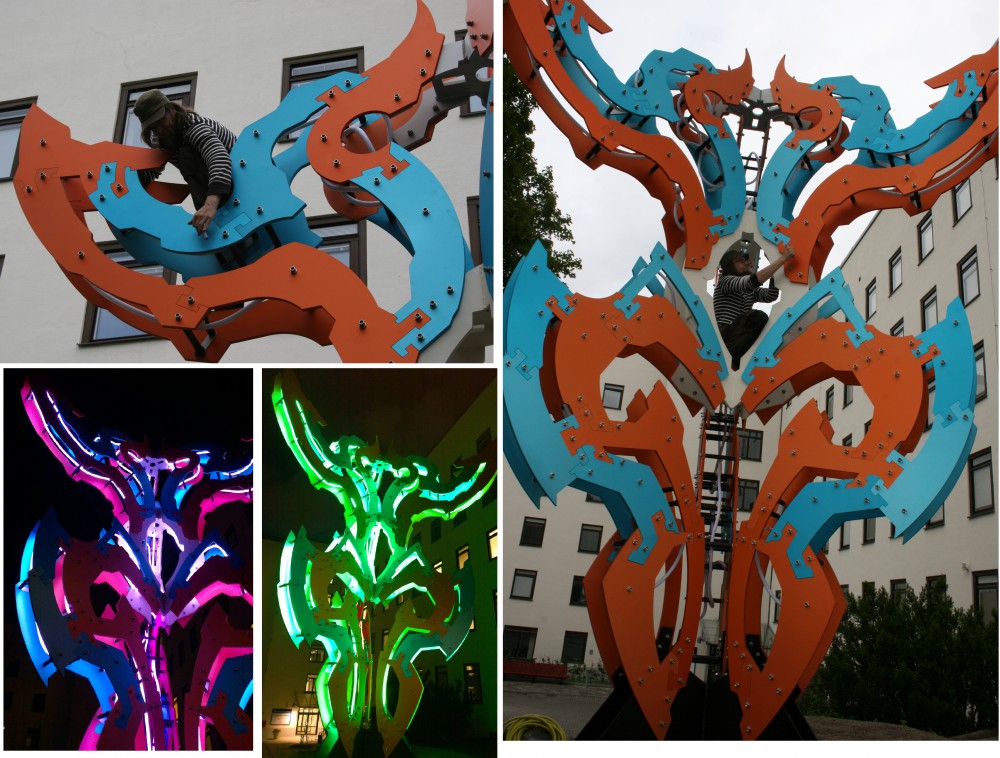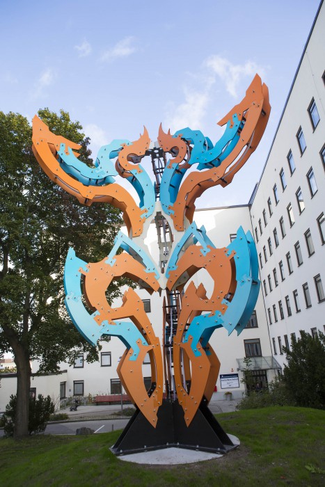 Beställare: Stockholms läns landsting. Vattenskuren Aluminium, Eloxerad färgning, LED belysning.Fakta: 6m hög, 2 ton material. 110 utskurna delar